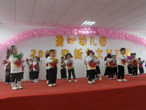 伊宁市爱心幼儿园于2008年12月29、30日举办了“2009年迎新年文艺汇演”活动,此活动分大班组、小班组两场进行。